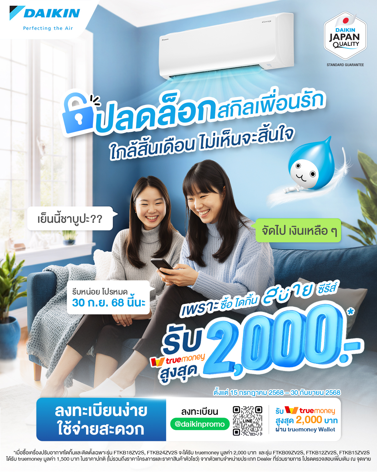 | 9,000 BTU | 12 - 15 ตร.ม. | ห้องนอนเล็ก, ห้องทำงานส่วนตัว |